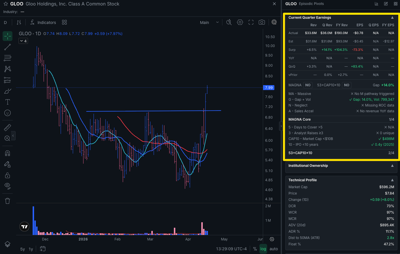 - The earnings tab summarizes the companies that have reported earnings from the prior days close. The Summary table provides a quick snapshot of how many of the MAGNA 53 Cap10*10 Checklist are present in the stock, the EPS and Sales details from the earnings report, the pre-market volumes and gap percent change.