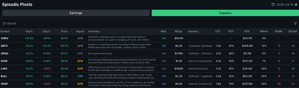 Gappers Tab: List of stocks gapping up more than 5% outside of regular trading hours at the time Qualliscan runs the analysis. A way to identify turnaround and thematic EP's.