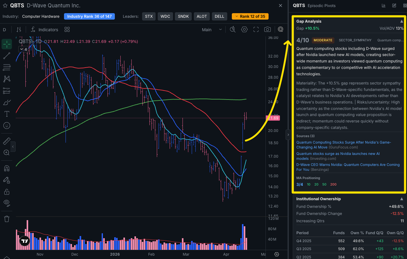 These aren't technical setups in the traditional sense. They're not about the shape of a base or the position of a moving average, though those factors matter for the entry. The Episodic Pivot is fundamentally a catalyst-driven event. The chart is just where you observe the evidence.
