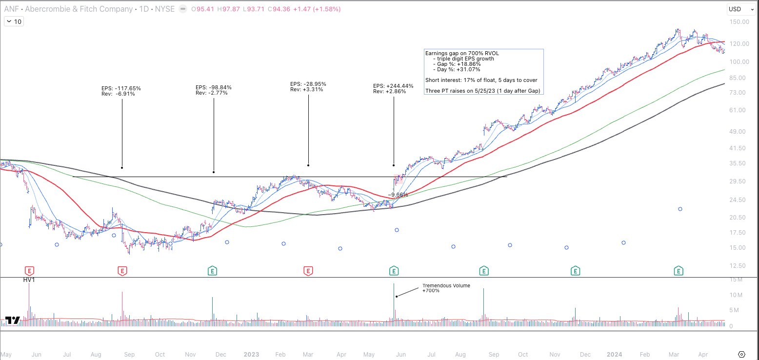 - ANF (Abercrombie & Fitch) in 2023, which went from a retailer no one cared about to a massive multi-month winner after a stunning earnings turnaround. The earnings gap was met with tremendous volume.