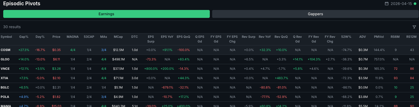 Even the best individual setup will underperform in a hostile tape. Episodic Pivots work because they create a fundamental re-rating event — but a weak overall market can hold back genuine catalysts.